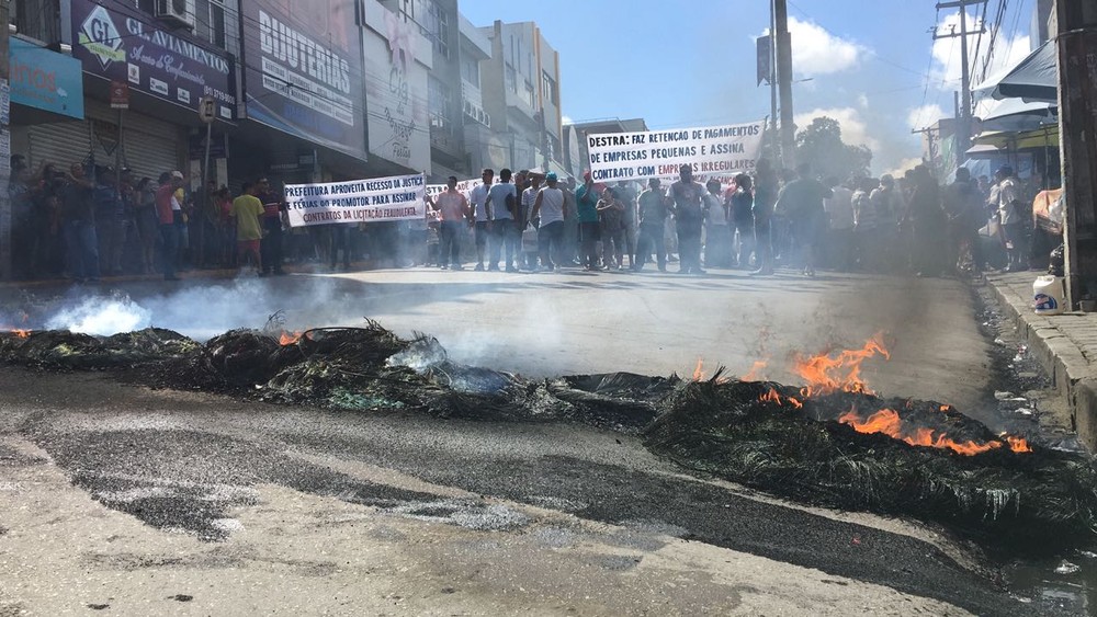 Os funcionários exibiram faixas cobrando um posicionamento da Autarquia Municipal de Defesa Social, Trânsito e Transportes (Destra) e questionando a forma como a licitação do transporte público foi feita. O Corpo de Bombeiros foi acionado e apagou as chamas. A via foi liberada.