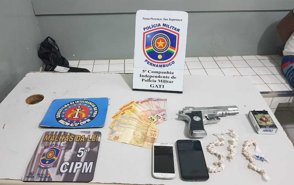 Um jovem de 19 anos foi preso no sábado (1º) suspeito de tráfico de drogas em Gravatá, no Agreste de Pernambuco. De acordo com a Polícia Militar, foram encontradas com o suspeito 84 pedras de crack, um simulacro de pistola, R$ 371 e dois celulares.