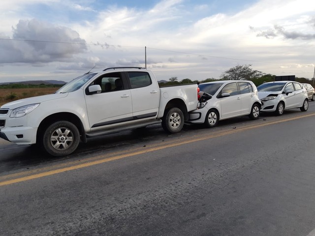 Um engavetamento com três carros deixou uma pessoa levemente ferida na tarde deste sábado (21) em Cachoeirinha, no Agreste de Pernambuco. O acidente aconteceu na BR-423. Segundo a Polícia Rodoviária Federal (PRF), os dois veículos da frente frearam perto de uma lombada. O terceiro motorista não percebeu a redução de velocidade e acabou batendo no segundo carro, que também bateu no primeiro. Uma pessoa ficou ferida no nariz e foi atendida pelo Serviço de Atendimento Móvel de Urgência (Samu).