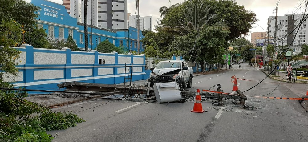 Um motorista perdeu o controle da direção e derrubou um poste de energia em um acidente na madrugada desta quinta-feira (27), na Avenida Rui Barbosa, no bairro das Graças, na Zona Norte do Recife. A colisão aconteceu próximo ao Colégio Presbiteriano Agnes Erskine . O poste caiu e ocupou todas as faixas da via. Por volta das 8h20, duas faixas foram liberadas e uma continuava interditada. Agentes da Autarquia de Trânsito e Transporte (CTTU) orientaram como rota alternativa seguir pela Rua Amélia. A circulação de veículos ficou complicada e, por volta das 8h, havia registro de engarrafamento em trechos da Zona Norte. Imagens feitas pela TV Globo mostraram que o airbag do motorista foi ativado na colisão. O carro envolvido no acidente pertence à Secretaria de Saúde de Santa Cruz do Capibaribe. O motorista permaneceu no local do acidente, sem ferimentos, e não gravou entrevista. O veículo foi retirado da via pouco antes das 8h. Com a derrubada do poste, moradores das proximidades ficaram sem energia. Uma equipe da Companhia Energética de Pernambuco (Celpe) foi enviada ao local para fazer a troca do equipamento e restabelecer o serviço. Por meio de nota, a companhia informou que 90% dos moradores que ficaram sem energia teriam o serviço normalizado até às 9h. "Os demais terão o fornecimento restabelecido após a substituição do poste e transformador atingidos pelo veículo, com previsão para o fim da manhã", disse. O Corpo de Bombeiros informou que foi acionado para o acidente por volta das 5h20, mas que não foi necessário efetuar resgate.