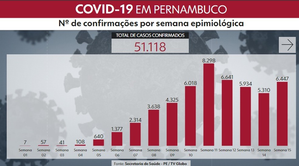 Pernambuco voltou a registrar alta no número semanal de casos confirmados de Covid-19, doença causada pelo novo coronavírus, em meio ao processo de reabertura das atividades econômicas. Nas três semanas anteriores, o estado vinha registrando diminuição desse número. Entre o domingo (14) e este sábado (20), foram 6.447 confirmações da doença. O maior número de casos registrados em uma semana no estado foi entre os dias 17 e 23 de maio, com 8.298 novas pessoas com a doença. Nesse período, foi decretada quarentena mais rígida por 15 dias no Recife e outras quatro cidades da Região Metropolitana e os números começaram a diminuir, até esta semana. Somente neste sábado (20), a Secretaria Estadual de Saúde contabilizou 1.398 novos casos de Covid-19, maior número registrado desde o dia 29 de maio, quando foram registrados 1.542 casos em um único dia. Desde o começo da pandemia, em março, a maior confirmação de casos em um dia foi registrada em 16 de maio, quando foram 2.279 pacientes. Neste sábado (20), as praias e parques do Recife foram liberados para exercícios individuais. Mesmo com o banho de mar proibido, muitas pessoas foram vistas entrando na água em Boa Viagem, na Zona Sul da capital