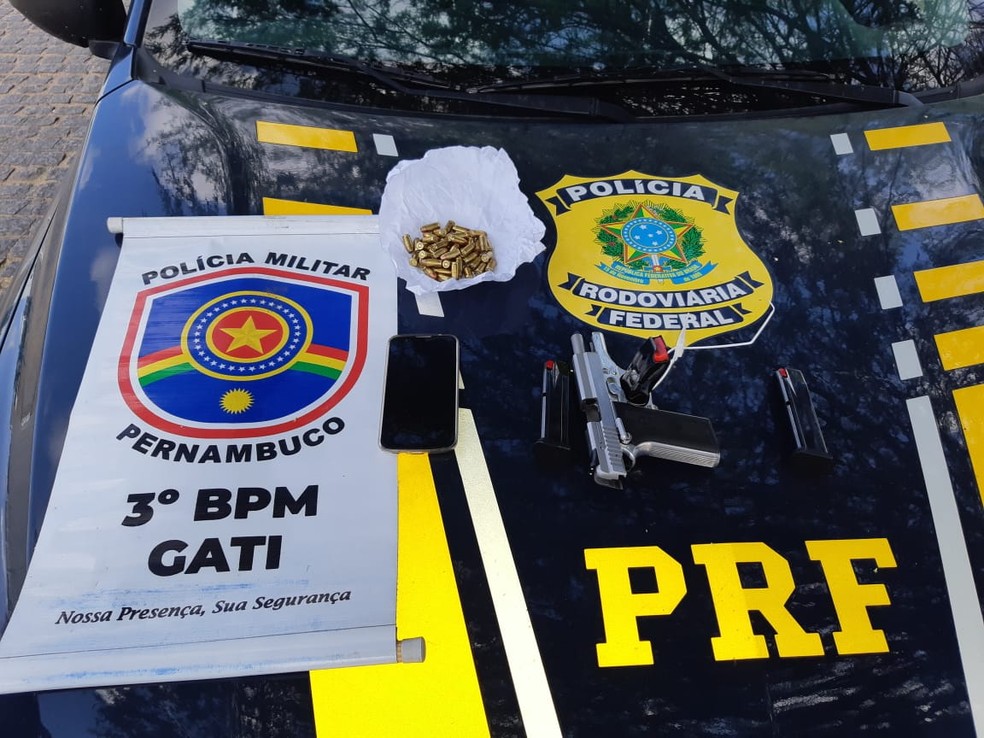 Um homem de 26 anos, foragido do presídio de Canhotinho, no Agreste de Pernambuco, foi detido pelo 3° Batalhão de Polícia Militar (BPM) com o apoio da Polícia Rodoviária Federal (PRF), no domingo (18), na BR-232, em Arcoverde, no Sertão. Ele estava em um carro adulterado e portava uma pistola com 15 munições no momento da abordagem. Os policiais militares realizavam uma fiscalização no quilômetro 253 da rodovia, quando abordaram um carro com placas de Recife. Dentro do veículo, foi encontrada a arma no assoalho do passageiro. Após consulta, foi constatado que havia um mandado de prisão em aberto para o motorista desde setembro de 2018. A PRF foi acionada e descobriu que o carro possuía diversos sinais de adulteração. O homem foi levado junto com a pistola, as munições e o carro à delegacia de Polícia Civil de Arcoverde, para a adoção dos procedimentos legais.
