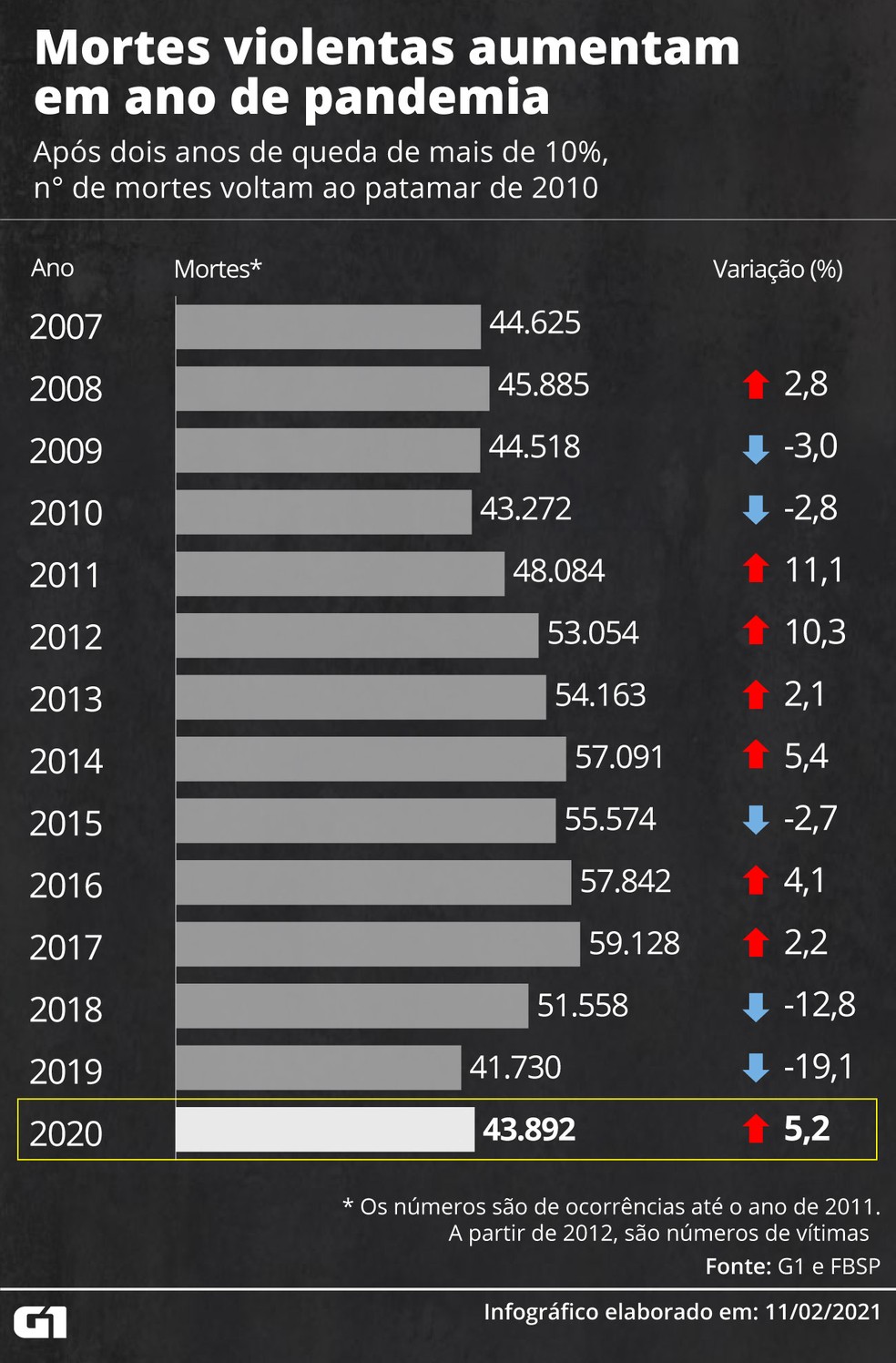 O Brasil teve uma alta de 5% nos assassinatos em 2020 na comparação com 2019, após dois anos consecutivos de queda. É o que mostra o índice nacional de homicídios criado pelo G1, com base nos dados oficiais dos 26 estados e do Distrito Federal. No ano passado, foram registradas 43.892 mortes violentas, contra 41.730 em 2019. Ou seja, 2.162 mortes a mais. Estão contabilizadas no número as vítimas de homicídios dolosos (incluindo os feminicídios), latrocínios e lesões corporais seguidas de morte. O aumento de mortes aconteceu mesmo durante a pandemia do novo coronavírus e foi puxado principalmente pelo Nordeste, que teve um aumento expressivo nos assassinatos: 20%. É importante ressaltar que a região também foi a grande responsável pela queda de mortes nos últimos dois anos. A região Sul também teve uma leve alta. Já nas outras regiões (Norte, Centro-Oeste e Sudeste), o número de crimes violentos foi menor na comparação com o ano anterior. A região Norte teve a queda mais acentuada: - 11%. Ao todo, mais da metade dos estados registrou uma alta. Houve aumento dos assassinatos em 14 unidades da federação.