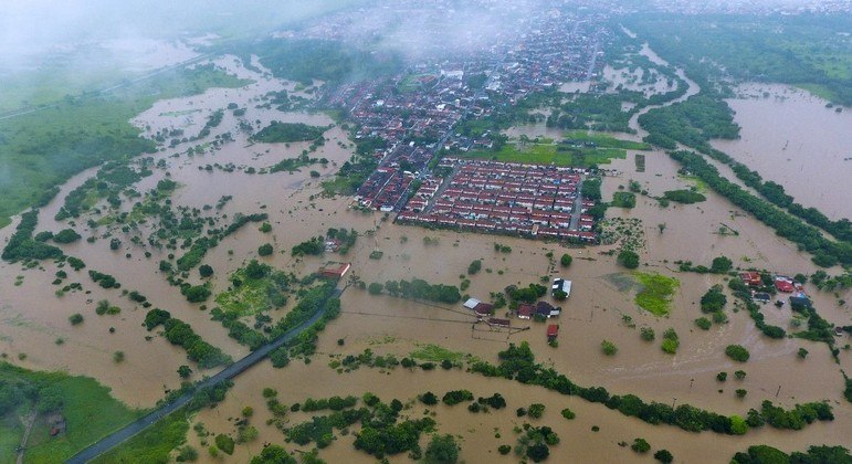 Uma cidade destruída. Em Itabuna, no sul da Bahia, a chuva cobriu a ponte do rio Marabá, que fica no centro da cidade. A enchente começou na noite da última sexta-feira e desabrigou centenas de famílias.