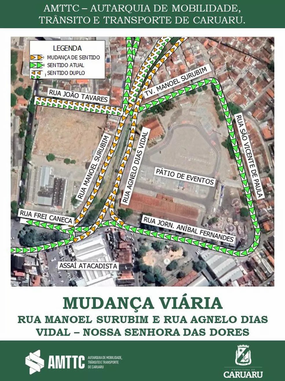 Algumas ruas próximas ao Pátio de Eventos, no Centro da cidade, passarão por mudanças no sentido de fluxo. Segundo a Autarquia de Mobilidade, Trânsito e Transportes de Caruaru (AMTTC) a mudança vai acontecer a partir da quinta-feira (18).