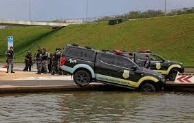 d'água em frente ao Congresso, um carro da Polícia Legislativa estava