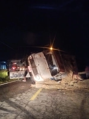 CAMINHÃO TOMBA NA PE-120 DURANTE A MADRUGADA NA ZONA RURAL DE AGRESTINA.
